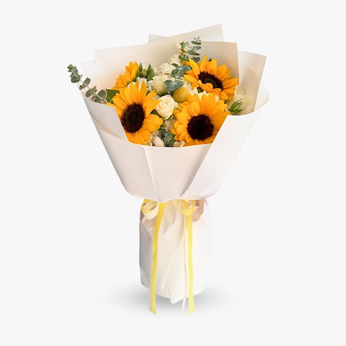 Este maravilloso ramo de 4 girasoles complementados con delicadas minirosas es el regalo perfecto para llenar cualquier espacio de luz y alegría. Dejamos que la belleza natural de las flores hable por sí misma, destacándolas con un papel decorativo cuidadosamente elegido y un elegante lazo amarillo que resalta aún más su encanto.