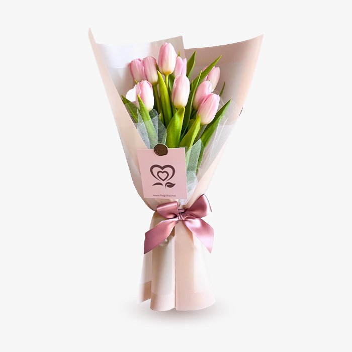 El ramo viene envuelto en papel decorativo de diseño clásico, añadiendo un toque de refinamiento a los tulipanes. Además, está coronado con un lazo rosado que realza su encanto y lo convierte en un regalo perfectamente presentado.